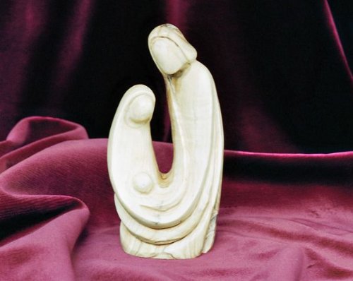 Maria, Giuseppe e il Bambin Gesù realizzati da un pezzo unico di legno d'ulivo. Venatura molto bella. Adatta ad essere esposta tutto l'anno. Altezza 14 cm