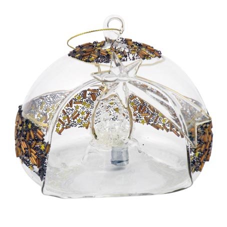 Premessa: questa Palla di Natale essendo un oggetto particolare e fragile, Lo Staff di Misterpoint Group riserva e garantisce un'imballo adeguato per avere un trasporto e consegna sicura al 100%. Palla di Natale con all'interno un fantastico Presepe in vetro soffiato. Castonata di stupende pagliuzze bronzate! Nella parte frontale si nota benissimo la stella di natale rifinita anche questa con dei piccoli profili bronzati.